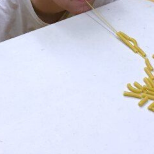 With the uncooked spaghetti noodle in their mouth, the player attempts to pick up as many penne pasta noodles as they can in one minute (without using their hands).